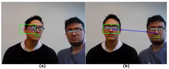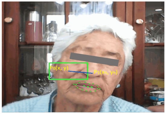 If the user maintains an open mouth for more than the time it takes to capture 15 consecutive frames, the activation state of the control of pointer position is flipped. Immediately, an event notification is sent to the voice alert module to play the corresponding message. If the pointer control is activated, the position of the central coordinate of the nose () is captured and saved in . It will be used as a reference point for later calculations to determine cursor movements. Pointer movement is achieved by applying a function in which (, ) is compared with the previously defined reference point . In Figure 5, it can be seen that a green rectangle with dimensions of 60 × 30 and a segment (blue line) are drawn on the user’s face to generate a reference for the pointer movement. When surpasses the limits of the rectangle, the pointer will move in the direction from which it came (up, down, right, or left).