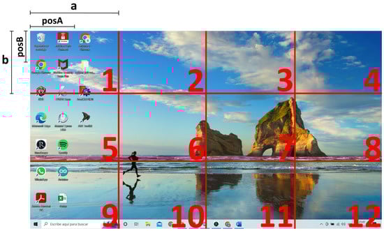 To calculate the exact coordinates of the quadrant of the screen, the dimensions of the screen are extracted and a specific formula is applied depending on the quadrant row where the user wants to position the pointer. Figure 7 illustrates the parameters required to calculate the coordinates. “a” is a quarter of the screen width, “b” is a third of the screen height, “posA” is half of “a”, and “posB” is half of “b”. These values depend on the screen resolution.