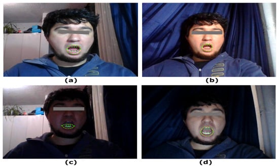 In order to determine if the mouth is open, a relationship between the coordinates of the points to of the facial landmarks is assessed. These points correspond to the inner section of the mouth. First of all, the distance between parallel coordinates of the mouth is calculated. Coordinates and , and , and are used to determine the height of the mouth; the distance between and defines the width of the mouth. Secondly, the Mouth Aspect Ratio (MAR) presented in Equation 1 is calculated. This equation is based on the concept known as the Eye Aspect Ratio (EAR) [30]. The MAR value will vary depending on the position of the lips. When the user opens his mouth, a threshold value established at 0.6 will be exceeded, indicating an open mouth, where – are the coordinates shown in Figure 4, corresponding to the lower part of the lips.