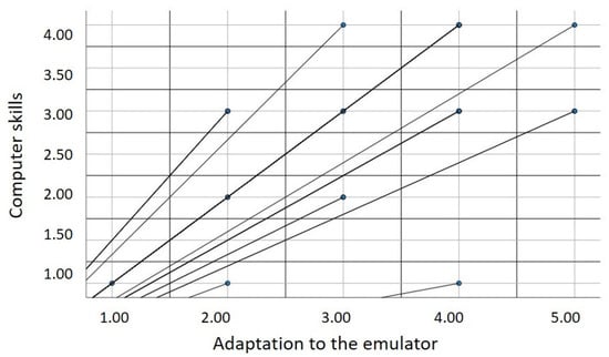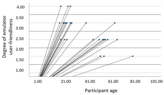 In the analysis carried out, it was found that there is a statistically significant correlation between age and the degree of ease of using the emulator, with r = −0.56, p < 0.001 (see Figure 15). This means that the younger the users are, the easier it is for them to use the emulator. As expected, elderly people have greater difficulty.