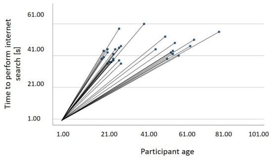 In the statistical analysis carried out, it was found that there is a statistically significant relationship between the participants’ age and the time taken to perform the query, with r = 0.46, p = 0.01 (see Figure 13). This positive correlation means that as the age of the users increases, it take longer for them to look up information on the internet using the emulator.
