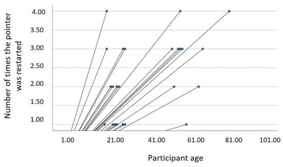 In the statistical analysis carried out, it was found that there is a statistically significant relationship between age and the number of times the pointer was restarted, with r = 0.40, p = 0.02 (see Figure 14). This positive correlation means that as the age of the users increases, the number of times the cursor movement must be restarted also increases.