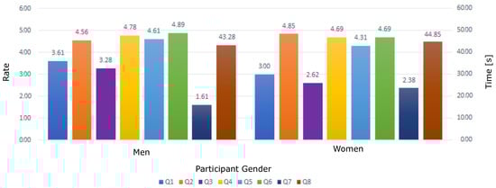 When comparing the answers to the survey according to the gender of the participants, it was found that there are statistically significant differences in Q1 (t (29) = 3.05, p = 0.002), Q3 (t (29) = 3.05, p = 0.001), and Q7 (t (29) = 2.99, p = 0.003) (see Figure 16). The questions considered for this analysis are listed in Table 3. As we can see, the results show that men have more computer skills than women; thus, adaptation to the emulator for men was easier.