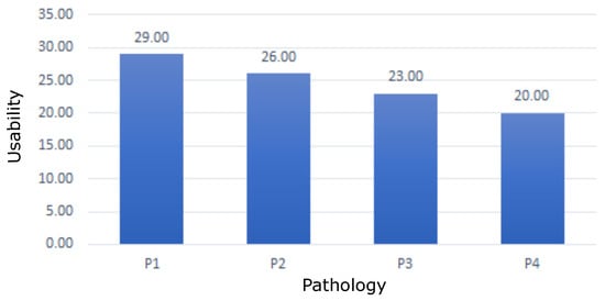 Figure 17 indicates the mean usability by pathology. Each question in Table 6 has a maximum score of 5 points. The highest score corresponds to a positive evaluation of the question. By adding the punctuation of the questions, the emulator usability variable was constructed. It yielded results of Min = 20.00/35.00, Max = 29.00/35.00, M = 24.50, SD = 3.87. From the results, it can be seen that participants considered EMKEY to be quite useful and quite easy to use.