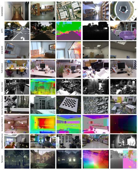 The mentioned datasets are used in multiple VSLAM methodologies according to their sensor setups, applications, and target environments. These datasets mainly contain cameras’ extrinsic and intrinsic calibration parameters and ground-truth data. The summarized characteristics of the datasets and some instances of each are shown in Table 1 and Figure 3, respectively.