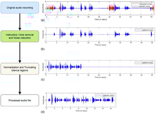 Waveforms of (a) original audio signal, (b) audio after removing instructor’s voice and applying noise reduction, (c) audio after normalization and truncating silence, and (d) final pro-cessed audio file.