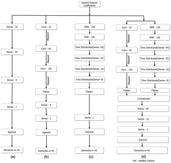 Since the speech features are portrayed as variation over time, a one-dimensional CNN model has been utilized which can capture significant patterns in the speech features. The convolution operation extracts temporal information by sliding predefined filters over the input []. The proposed model designed to identify dementia patients is shown in Figure 3b. The network consists of four convolutional layers, four max-pool layers and three fully connected layers. The activation functions used in the network are the ‘ReLU’ activation and the ‘Sigmoid’ activation. The MFCC, GTCC, their delta-coefficients, fundamental frequency, formants, and the log-energy are provided as input to the CNN model.