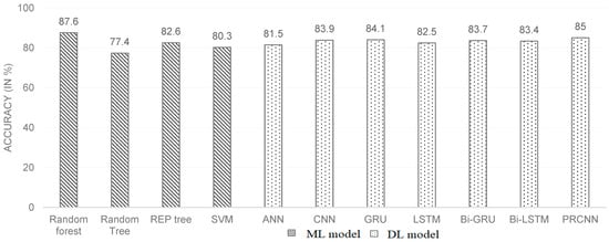 Bar graph showing comparisons of average (five-fold) validation accuracies of the proposed ML and DL models.