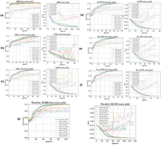 The accuracy and loss curves for the five-fold in (a) ANN, (b) CNN, (c) GRU, (d) LSTM, (e) Bi-GRU, (f) Bi-LSTM and (g) Parallel RCNN.