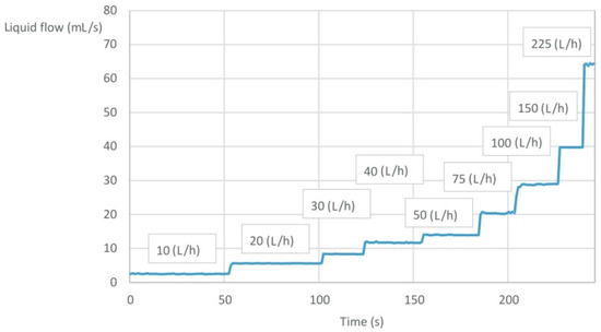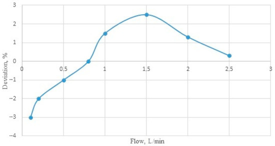 The FT-210 Gems Sensors (a flow turbine sensor) allow for the accurate testing of the liquid flow, regardless of its physical parameters, such as density or temperature. Each rotation of the rotor means that a certain amount of the liquid flows through it. For the FT-210 sensor, the minimum tested flow is equal to 1.7 mL/s, and the maximum is 41 mL/s. Within the measuring range, each revolution of the rotor generates an impulse, and 22 of these impulses represent a flow of 1 mL of the liquid. The accuracy of the meter is ±3% (Figure 2), and its repeatability is 0.5%. The flow sensors were calibrated before starting the tests.
