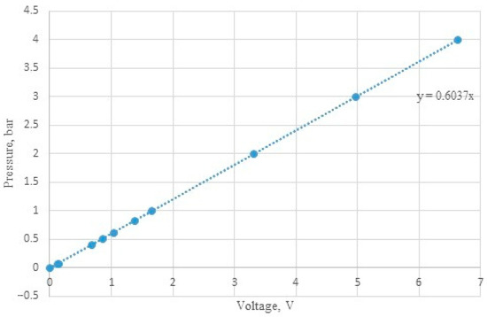 A piezoresistive Loxone pressure sensor with range 0–10 V was used. It measures the relative pressure with a repeatability of 0.5%, and within the range of 0–6 bar. As a result of the technological limitation of the PLC, it was necessary to introduce an appropriate calibration correction (Figure 3). Due to this, the measurement error was reduced to the lowest possible value. The pressure of the liquid (up to 2 bar) and the air (up to 4 bar) was verified using the Digicomb pressure sensor from Tecsis Company, and the obtained results were then compared with the readings of the system.