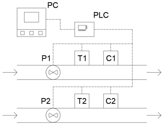 Figure 5 shows the schematic view of an example of the working system. Thanks to two sets of the sensors, it is possible to measure parallel objects, input and output from a reactor, or any other combination of the two systems. The PLC, which controls the sensors, collects the data that are downloaded every second by the application running on a personal computer.