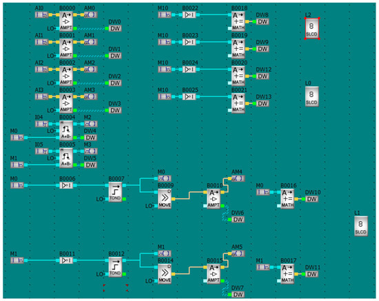 Figure 6 shows the program that supports the PLC, and, through the PLC, it also supports the sensors. The signal amplifications or the mathematical operations are carried out by the controller in order to avoid possible delays in the processing of the results during their display on the personal computer. The desktop application downloads the signal processing results from the prepared DW8–DW13 registers.