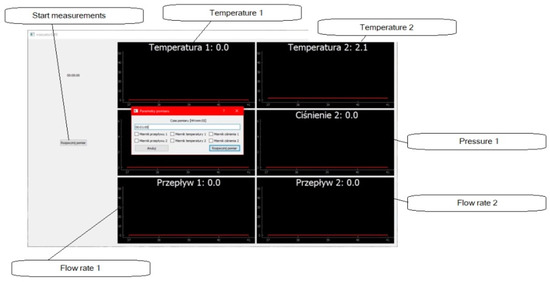 In order to ergonomically monitor the measurement, the desktop application was written in Python [23]. The connection of a personal computer with the PLC unit via the RS232/USB interface enabled data to be exchanged between these devices, which communicate using the Modbus protocol. The application downloads the data of the parameters, which are stored in the PLC registers, and then displays them in the appropriate GUI fields (Graphical User Interface). At the request of the user, the application can save measurements from the selected sensors and for the selected time period. In order to optimize the use of a computer memory, the files are saved every hour (maximum). During the saving of the measurements, the application displays the signal vs. the time graphs, which enables the measured system to be easily and quickly described.