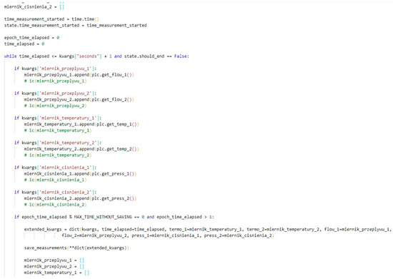 Both in the scope of firmware for the PLC (Figure 10) and the desktop application (Figure 11), constant frequency of pressure and temperature readings was established for both sets of the sensors. The user application is multithreaded. The processes of reading the data, generating the graphs and recording the measurements are separated from each other. Probably thanks to this, the registration or the chart generation operations do not affect each other. The proposed solution enables the integration of the solutions in the field of the Internet of Things. The direction of further research should be the development of the IoT Gateway with the use of the COTS (commercial off-the-shelf) components. The advantage of this approach is the possibility of using (modernizing) older elements of the industrial lines.
