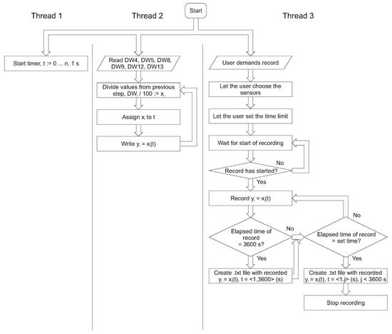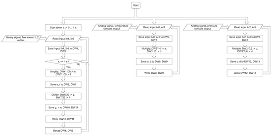 One of the main tasks was the integration of the PLC with the desktop application. It requires a new algorithm, where the measurements’ accuracy will be consistent with the frequency of collection and with the transfer of the samples. The first algorithm is dedicated to the flow meter (Figure 10). It has three main loops dedicated to the reading of the analog sensors and the data persistence. This guarantees the possibility of the adaptation of or change in the sensor types without affecting the PC desktop application. The hardware part of the flow meter is separated from the user application; therefore, it can be integrated as part of a larger industrial system. The developed prototype has two uses. It is a new and precise research apparatus important from the point of view of further research. There is also a proof of concept in the field of hardware and software solution configuration in the context of the industrial implementation. In addition, the use of multithreading in the field of the sensor readings ensures greater accuracy of the measurements and correlation of the temperature and the pressure readings.