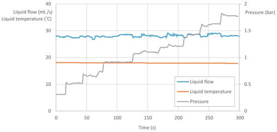 Figure 15 shows an exemplary long-term record of the selected quantities for the two-phase gas–liquid flow in an effervescent atomizer. The liquid flow rate was set on constant (flow rate value for VA 40; 100 L/h), while the gas flow rate was changed. The values recorded and presented in Figure 15 were: liquid flow rate, pressure drop at the atomizer and liquid temperature. The average value of the liquid flow rate read by the PLC meter was 101 L/h with the accuracy ±3%.