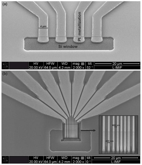 The 4-microthermocouples shown in Figure 3a were fabricated using photolithography techniques only, while the thermocouples presented in Figure 3b were prepared with FIB milling using the Helios 600 NanoLab DualBeam system. The FIB system is an excellent micro- and nanotechnology tool enabling easy prototyping [,] or post-processing customization of individual devices []. Thus, the micro- and nanostructures can be fabricated more precisely and much faster than when standard photolithography or imprint methods are applied.