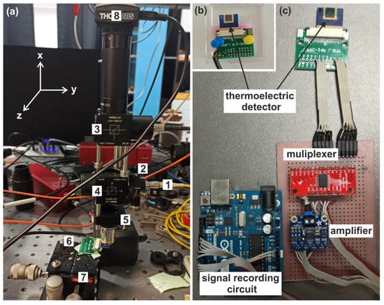 Figure 4a shows the light source of the experimental setup. This part consists of a fiber-coupled semiconductor diode laser emitting light with the wavelength λ0 = 976 nm. The light was guided by a single-mode fiber (1), which maintains the original profile of the light beam during its propagation. The fiber was connected to the fiber collimator (2) that formed the plane wave to keep the same light intensity over the light propagation. Two beam splitters were used to redirect the light toward the detector. The first one (3) redirected the white light to illuminate the investigated area, while the other (4) redirected the IR light beam. The IR beam was focused by the microscope objective with 40× magnification (5) and illuminated the detector (6). The power of the incident light beam measured by the power meter (digital handheld optical power and energy meter console, PM100D, THORLABS) immediately after leaving the microscope objective was equal to P0 = 300 µW. The spot diameter of the illuminated area was equal to D0 = 1 µm and covered the hot junctions. The cold junctions were not illuminated to prevent their heating. The CMOS camera (8) controlled the alignment of the light spot and the junctions. The detector was fixed to the stage (7), moving it in the XY plane.