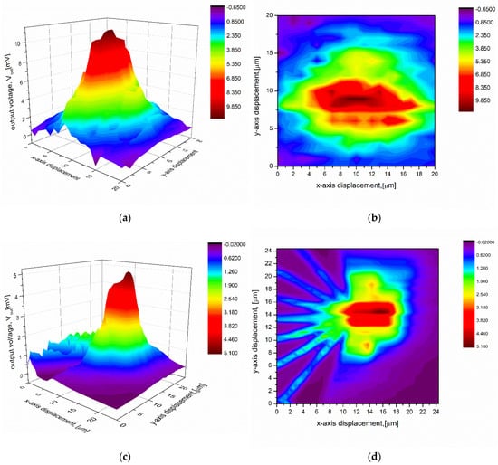 The measurements reconstruct the Gaussian profile of the incident light beam (Figure 5a). It can be noticed that the highest output voltage is equal to ca. 11 mV, while the voltage measured with the nanoscale thermocouple is equal to ca. 5 mV. The small displacement step of the nanoscale thermocouples gives a higher spatial resolution of the measurements. Thus, a more detailed topology is shown in the picture (Figure 5d) representing measures taken with the nanoscale detector than with the microscale one (Figure 5b). The layout of the thermocouples is clearly recognizable in Figure 5d (the 2D graph) and reflects the original layout correctly.