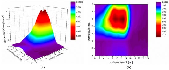 Figure 6a,b depict the temperature difference between hot and cold junctions after illumination. The presented values were calculated based on the measured output voltage and the previously found value of the thermoelectric coefficient assessed at 0.54 mV/K for the thermocouple pSi-Ti/Pt. Furthermore, the 2D graph pictures the temperature distribution on the surface illuminated directly by the incident light in the area. The maximal value of the temperature increase induced by the incident light was equal to 10.9 K and corresponded to a measured output voltage of 5.88 mV.