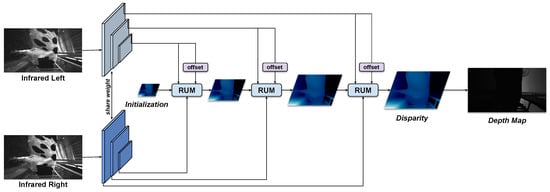 - Li, J.; Wang, P.; Xiong, P.; Cai, T.; Yan, Z.; Yang, L.; Liu, J.; Fan, H.; Liu, S. Practical stereo matching via cascaded recurrent network with adaptive correlation. In Proceedings of the IEEE/CVF Conference on Computer Vision and Pattern Recognition, Vancouver, BC, Canada, 18–22 June 2022. [Google Scholar]