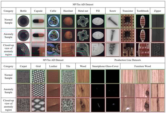 MVTec AD [23] is currently one of the most widely used industrial datasets for anomaly detection [24,25,26,27,28,29]. The dataset contains 3629 training images and 1725 verification data points. It includes 15 categories: five of these correspond with texture detection items, whereas the remaining pertain to object detection items. These multiple types of components make MVTec AD more comprehensive in terms of evaluating the detection ability of a deep learning model. Sample data are shown in Figure 3.
