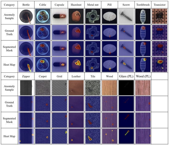 MVTec AD can be used to determine the detection ability of anomaly detection models in various projects. As listed in Table 2, the proposed method has the highest AUC for 14 of the 15 categories. Moreover, it is worth noting that the proposed method shows considerably better anomaly detection performance under four categories, including cables, metal nuts, tiles, and transformers, as compared with the previous detection methods. All these inspection categories have complex variations among the images, and the defects have irregular textures, which necessitates better feature extraction ability. Because AnoGAN, GANomaly, and Skip-GANomaly do not have a pre-trained feature extractor, they suffer from the problem of insufficient feature extraction ability when detecting these categories, thereby resulting in poor detection ability. However, although DFR has the architecture of a pre-trained feature extractor, the image reconstruction ability of its autoencoder is not qualified. Conversely, the advantages of the proposed method were remarkable because of its strong feature reconstruction ability and effective pre-trained feature extractor. The heat maps and segmented masks of the MVTec AD are shown in Figure 4. It can be observed from the figure that the proposed method can accurately segment the abnormal parts in the image.