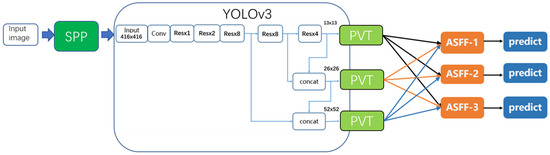 The overall framework of our work. SPP means integrating spatial pyramid pooling, ASFF means adaptive spatial feature fusion and the detection algorithm is based on the YOLOv3 network.