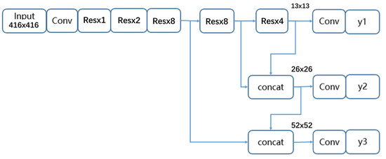 YOLOv3 belongs to a one-stage detection algorithm, which can classify and locate objects in images through a single convolutional network. It uses DarkNet53 as its backbone to extract feature maps of images, which outperforms the ResNet50 [25] and DarkNet19 [26] module. Taking a resolution of 416 × 416 as an example, it can obtain three different scales of feature maps, including 13 × 13, 26 × 26, and 52 × 52. Multi-scale detection is performed according to these feature maps of different sizes. To improve the detection performance of small targets, YOLOv3 borrows the FPN module to fuse different feature maps. In Figure 3, the “Conv” unit represents the common convolutional layer. The “Res” unit represents the shortcut structure borrowed from ResNet. It contains two convolutional layers and one residual layer. “x8” means this unit will repeat eight times. “concat” represents the concatenation layer, which can concatenate two inputs at the channel dimension. Units y1, y2, and y3 represent three detection layers. According to the preset anchor boxes, many bounding boxes are obtained from feature maps. Then, non-maximum suppression (NMS) is used to filter redundant bounding boxes and output the final detection results.