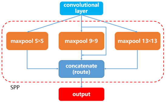 We add three SPP modules in front of the detection layers. The architecture of the SPP module is shown in Figure 4. The SPP module consists of three different formats of the maxpool operation (including 5 × 5, 9 × 9, and 13 × 13). It can fuse the output feature maps of the three maxpool layers. The SPP module has some advantages. Firstly, it can output a fixed size of feature maps, which will solve the problems caused by different sizes of input images. Secondly, the SPP module extracts features from different aspects and concatenates them in the following. This can improve the richness of feature maps and make the algorithm more robust [27]. As SPP can cope with different aspect ratios and sizes of input images, it improves the image’s scale-invariance and reduces over-fitting. The output of SPP is a 416 × 416 image as the input of YOLOv3.