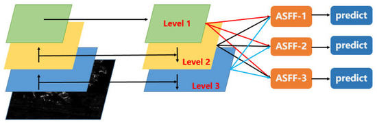 ASFF can fuse different scales of feature maps [28]. In Figure 5, the feature maps of level 1,2,3 are expressed as respectively, which can be generated using the pyramid vision transformer. The calculation process of ASFF module can be described by Equation (1):