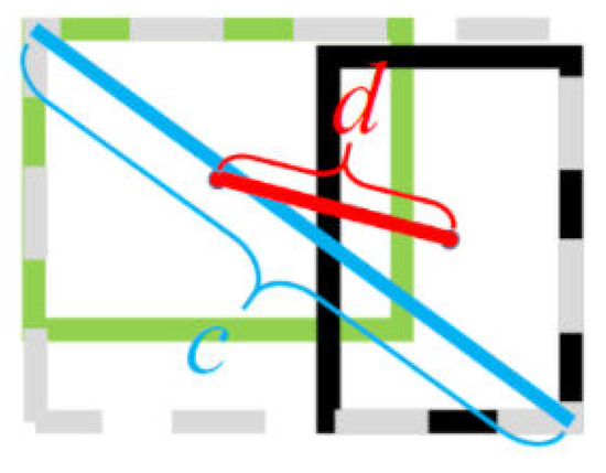 In Equation (2), is the score value of i-th bounding box. represent the value of intersection over union and the distance between the center points of two boxes respectively. M is the maximum value of score of bounding boxes. The calculation process of distance R is shown in the second equation in Equation (2) and Figure 6. is the Euclidean distance and c represents the diagonal length of the smallest box containing two boxes. We use DIOU-NMS to replace the original NMS, in order to achieve a higher detection precision.