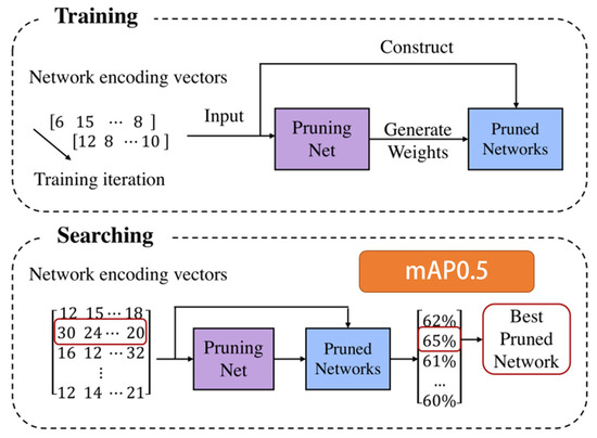 The MCP method consists of two steps, training and searching. Firstly, a PruningNet is trained, which can generate weights when giving a pruning strategy to obtain pruned networks. The pruning strategies can be written as (), representing the number of channels for the l-th layer, respectively. This process of generating weights can be written as Equation (4).
