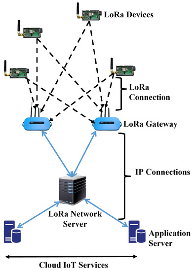 LoRa provides bidirectional communication via the chirp spread spectrum (CSS) modulation, which spreads a narrow-band signal over a wider channel bandwidth, making it more interference resistant [5]. LoRa primarily employs six spreading factors (SF) to adapt to the trade-off between the data rate and the communication range. In fact, the greater the SF, the greater the range with a lower data rate, and vice versa [6]. The data rates vary with the SF and channel bandwidth, ranging from 300 bps to 50 kbps. According to [7], LoRa technology is based on a star of stars topology, in which GWs relay messages between end devices and a central network server. This model is distinguished by the provision of a long-distance and reliable link via a special modulation technique, in which a LoRa GW collects raw data directly from end devices by single-hop communications and forwards it to a network server (NS) connected by a high-speed backhaul network as shown in Figure 1 [8].