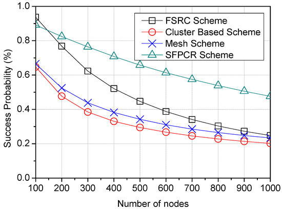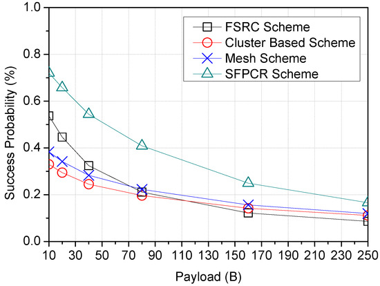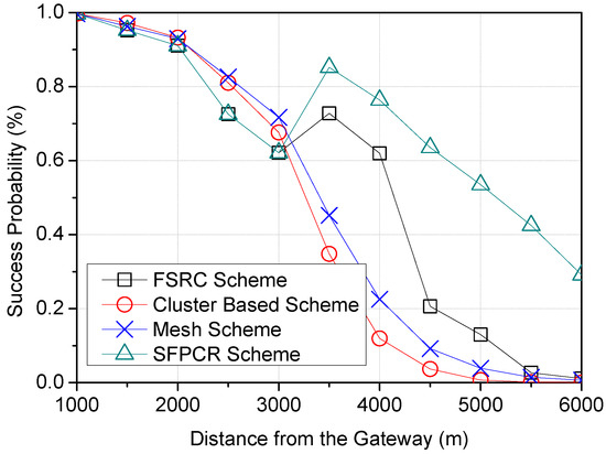 In this section, we examine the success probability of a signal in LoRa’s respective spreading factor regions under intra- and inter-SF interference. In this paper, we investigated the average success probability of LoRa devices in random locations in the field of an IoT LoRa network in order to determine the optimal number and positions of relay LoRa devices (LDs) in relation to the distance between a source LD and the GW. The proposed SFPCR scheme considers the evaluation of a source LD’s packet success probability using a varying SF to be dependent on the distance from the receiving LoRa device (i.e., the source LD (S) to the CH, the CH to the relay LD (R), and R to the GW). The collision of packets in a LoRa network is classified into two types: intra-SF collision and inter-SF collision [44]. If a transmission collides, the LoRa device becomes backlogged and slows down, resulting in excessive delay and packet loss. As a result, it is critical for the LoRa link to have a high data reliability.