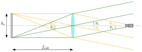 Under the assumption of perfect components’ alignment, the problem can be studied as outlined in Figure 2. As the light rays are collimated, i.e., the angles are constant for all rays in the beam, it can be shown from simple geometrical consideration that: