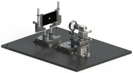 With regard to the collimator, by considering the screen and camera characteristics and using Equation (3), the collimator should have a focal length of mm. Because of this, the collimator has been chosen with a trade-off study among the available off-the-shelf components to maximize the observed portion of the screen while avoiding vignetting. Thus, the collimator used is a plano-convex lens with a focal length of 200 mm. The collimator is mounted on a dedicated assembly that is composed of a roto-translational stage and a post holder used to obtain vertical alignment between the collimator and the camera.