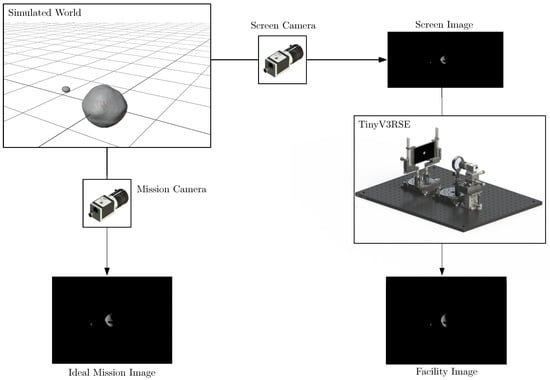 In Figure 5, the functional workflow used to generate the aforementioned images is shown. On the left side of the sketch, the ideal rendering is depicted where the ideal mission image is generated. These images are the ones used for preliminary design and algorithm prototyping, and are also used to assess the algorithm’s feasibility. On the right side of the sketch, the HIL counterpart is depicted where the screen image is displayed on the screen and the facility image is acquired by the camera.