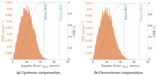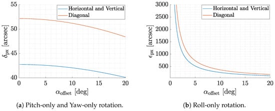 This is the angular size of the smallest features or objects to be displayed on the screen. Figure 6a shows the trend of as a function of the offset angle and underlines its low variability for the range of angles in the chosen camera FoV. For a pixel on the boresight, the value of is 45.5 arcsec. This value is of crucial importance as it not only defines the angular size of the smallest object to be displayed, but also sets a limit on the tested IP and VBN algorithms’ precision without software preprocessing. Moreover, as shown by Rufino et al. [16], this value can be interpreted as the maximum uncertainty in the feature projection when a yaw-only or pitch-only rotation occurs. On the contrary, when a roll-only rotation occurs, the maximum uncertainty in the feature projection is given by [16]: