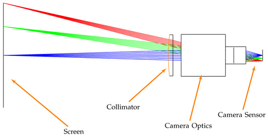 In this subsection, a distortion analysis is performed to understand how the light rays are deformed when passing through the collimator. It is assumed in this analysis that the whole distortion is due to the collimator while the camera mounted in TinyV3RSE does not affect the light rays emitted from the screen pixels. This approximation is considered to be valid since cameras are generally designed to limit the distortion on the sensor. To perform this study, a Zemax® model of the facility was developed as shown in Figure 7.
