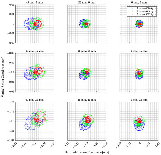 Each subplot shows a spot diagram per ray beam of rays for the three main wavelengths, i.e., blue, green, and red, emitted from different positions on the screen. Note that the same colors are used in Figure 7 for different screen-emitting heights and in Figure 8 for different wavelengths. The ray beam generation position is reported on the top of each subplot. Note that the position at 30 mm in height and 40 mm in width is located at the camera FoV limits. This implies that the worst-case scenario for the ray distortion is presented. It can be noted that distortions affect how the screen pixels are seen from the camera. The rays starting from the screen center have a symmetrical distribution, but correct focus cannot be achieved for all three analyzed wavelengths. The spot radii increase by increasing the distance with respect to the sensor center which implies the presence of Petzeval field curvature. This is because the screen image, when passing through the lens, is curved, and thus cannot be focused on the camera sensor which is a plane surface. The spot diagram also shows coma distortion at the FoV borders which implies that the projected screen pixels appear to have a tail in the image.