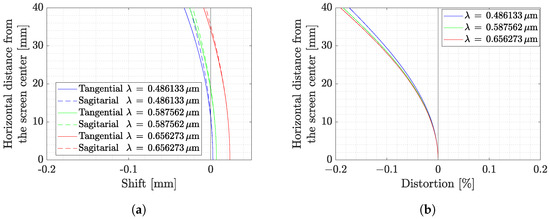 Field curvature and distortion analysis from Zemax® as a function of the horizontal distance. (a) Field curvature on tangential and sagittal planes for different wavelengths . (b) Field distortion for different wavelength .