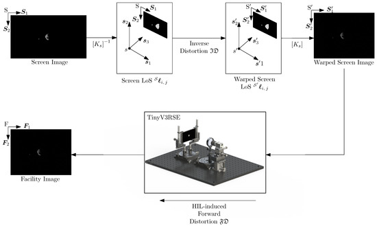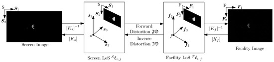 Let and be the ith dot in the jth calibration pattern in non-homogeneous and homogeneous coordinates, respectively. More details regarding non-homogeneous and homogeneous coordinates can be found in Hartley and Zisserman [30]. The homogeneous coordinates of expressed in the and reference frame are labeled and . If no hardware-induced artifacts were present, the line of sight (LoS) gathered from the screen and facility images would be equal: