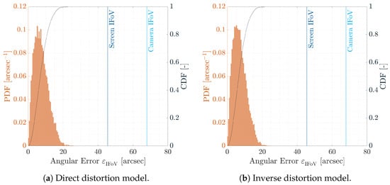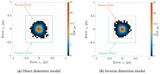 Therefore, two distortion models are estimated by projecting a series of calibration dot patterns on the screen and acquiring them through the camera. By knowing the calibration dot position on the screen images and the camera ones, the distortion models are estimated by least squares. Tang et al. [29] introduces various mathematical representations to model the optical distortion. Among these, polynomial distortion provides precise results that are compatible with arcseconds precision required for space applications [14,23].