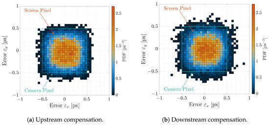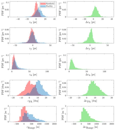 where and are the errors in the x- and y-components in the image plane. Moreover, the errors in the phase angle and range are labeled, respectively, as and , and are computed as well. The difference between the ideal-image error and the facility-image error is labeled by placing a before the corresponding variable (e.g., ).