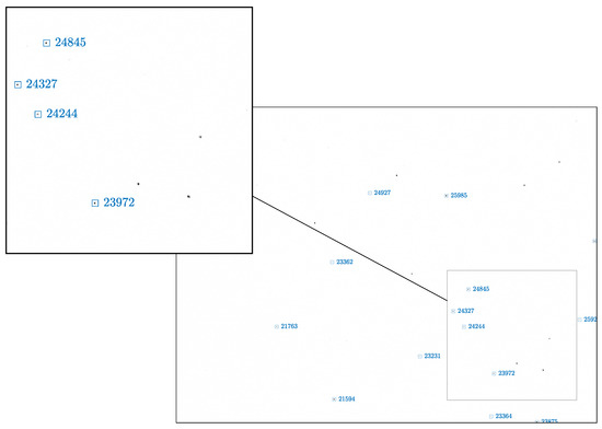 An example image, in reversed colors, of detected stars in a deep-space image for attitude determination. The identified stars are shown in blue boxes with the corresponding identifiers. The image is framed to show the image borders. Details of the image are shown in the box.