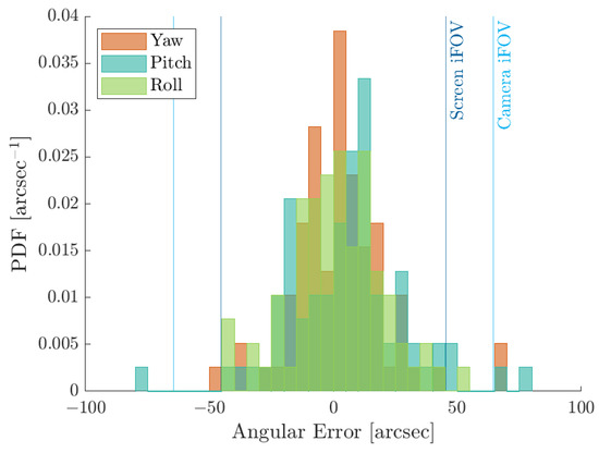 which is the error DCM between the estimated and true reference frame. The attitude is considered to converge to a feasible solution when the attitude error is below 200 arcsec. By considering this, the attitude determination has a success rate of 93.7% on the current dataset. Moreover, to represent the attitude error for the feasible cases, the roll–pitch–yaw Euler angles are shown in Figure 19. Results are consistent with the selected hardware, and the errors are bounded by the screen iFoV and the camera iFoV.