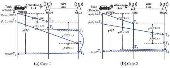 Case 1: In Figure 2a, vehicle n with a data size of bits is first transmitted to the RSU1 server (-). The execution time of bits of data on RSU1 is less than the time to transmit bits of data to RSU2 ( < ). When RSU1 finishes (), the results are transmitted to RSU2 (-). Afterwards, RSU2 processes the bits of data (-) and then returns the calculations of RSU1 and RSU2 to the vehicle n (-). Let (-) be the offloading delay, which includes the delay of uploading to RSU1 , the delay of uploading to RSU2 , and the delay of execution on RSU2 , which can be expressed as