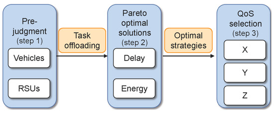The NSGA-II algorithm is based on biological evolution, and is suitable for complex and multi-objective optimization problems [15]. Compared with the original NSGA algorithm, it achieves faster and more accurate search performance, and is widely used. There are three main improvements: (1) a fast non-dominated sorting algorithm; (2) congestion degree comparison; and (3) an elite strategy. Based on NSGA-II, we propose using MOV to solve the offloading optimization problem by satisfying the application-specific QoS. The novelty is that the vehicle can selectively offload data according to different priorities of tasks and tolerance delays related to vehicle speed, allowing it to accelerate execution based on the previous optimal solution. An overview of our algorithm is shown in Figure 3. In Step 1, the vehicle judges whether execution should occur locally or be offloaded to RSUs for help according to the priority of the task. In Step 2, an improved NSGA-II is used to find the Pareto-optimal solutions minimizing delay and energy consumption for the tasks to be offloaded, where we design a special coding scheme based on the VEC scene. Our method can accelerate the algorithm execution speed based on the previous optimal solutions. In Step 3, a QoS model is established to carry out the optimal offloading strategy by achieving the individual QoS requirements of different applications. The MOV algorithm is shown in Algorithm 1.
